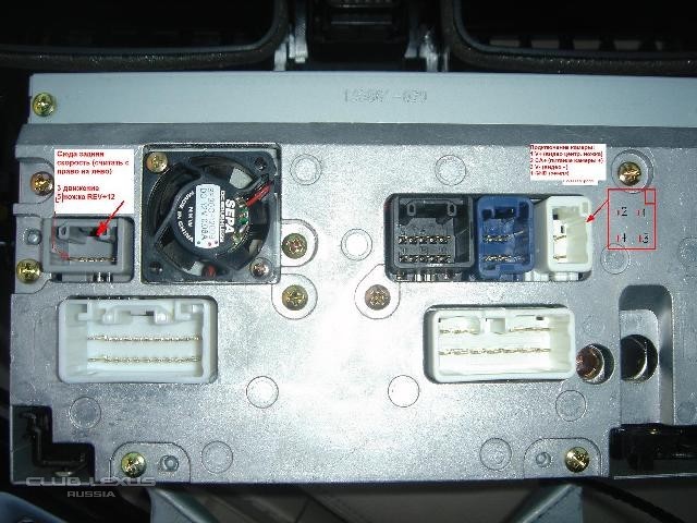 Подключил на стандартный разъем "головы" без каких либо доработок, камера NTSC, цветная. Камера установлена в накладку над номером, сделал вырез и залил (приклеил) пластмассой, провода проложил по левому порогу. Организовал активизацию видео входа от задней скорости, протянул один провод к "голове".