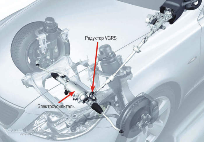 Смотришь на рулевую колонку. Там такая толстая муфта, которая и есть устройство VGRS. Из нее торчит кабель который заканчивается штекером который в свою очередь втыкается в блок ЭБУ (электронный блок управления). Вытаскиваешь этот штекер из ЭБУ путем нажатия на замочек штекера (сильно нужно нажать).