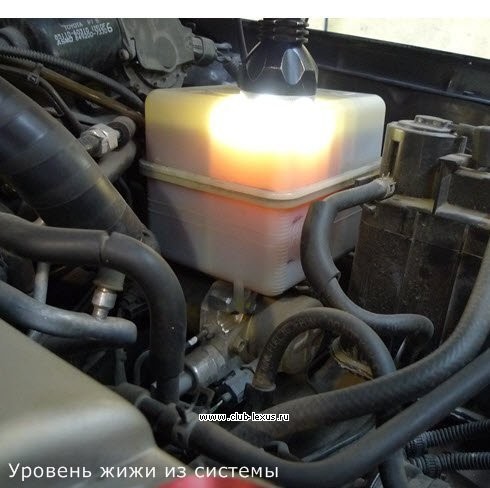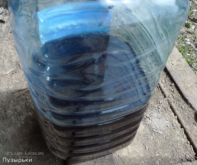 Кузов можно поднять на 5 см. выше положения Hi, но надо следить за уровнем в бачке, может все высосать и хапнуть воздух. У меня так и получилось. Опустил потом кузов, жижа выдавила воздух. Полез в подвал, там уже несколько месяцев стояла канка старой(но чистой) жижей. Долил жижу. Поднял кузов и решил посмотреть старую жижу на свету.