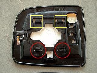 2) Как мне и сказали зеркало действительно на защелках, что видно при изучении новой детали. Две защелки находятся в верхней средней части зеркала и два прямых паза-защелки в нижней средней.