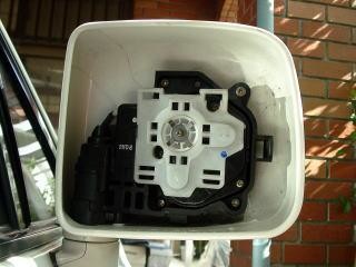 5)Отстегиваете зеркало уже без зеркального элемента и прикручиваете тем же саморезом это белое крепление обратно в корпус. Подсоединяете разъем подогреваантиблика. Не забываете поставить на место маленькую пружинку с левой внутренней стороны зеркала. Вставляете круглые направляющие управления зеркала в пазы. Затем верхние и нижние защелки. Надавливаете и ...все.