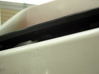 Придерживая верхнюю часть зеркала, чтобы оно не вышло из зацепления верхними защелками, придавливаем его по всей плоскости к белой рамке с герметиком. При этом покачиванием зеркала раздавливаем герметик, т.к. он не позволит остальным защелкам сразу замкнуться. Остальные защелки войдут на свои места сами собой, так что сразу и не поймешь.