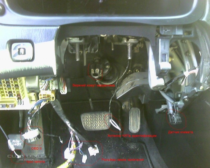 4. Теперь надо крутить... крутить надо ЭТО - три болта, крепящие блок подрулевых переключателей( два по верхним углам этого блока, углублённые, направленные вдоль вала), один снизу. направлен поперёк вала. Открутить два болта, крепящие к рулевой колонке пластину, на которой крепились подрулевые переключатели. Открутить Декоративную панель под рулевой колонкой ( на которой лючок с предохранителями - открутить два болта на 10 справа и слева внизу этой панели ( правый - под заглушкой). Сверху панель на пистонах. Дёргай её - она отвалится, осторожно дергай - на ней разъём OBD( слева) и датчик климата ( справа) ( увидишь как снимаются), а так же трос на капот. Открутить металлическую панель ( два болта на 10 по верхним углам.