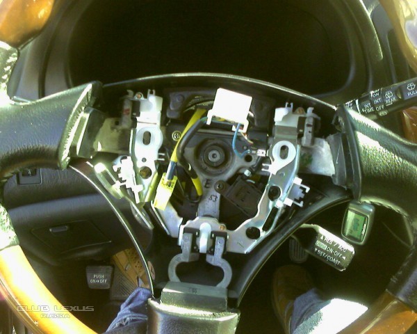 3. отцепить разъёмы подрулевых переключателей тут без особенностей. Разъём подушки ( жёлтый) вытащится только если отвести в сторону его боковину - стопор. В этом же разделе можно посоветовать отсоединить хомут, крепящий жгут проводов к рулевой колонке...