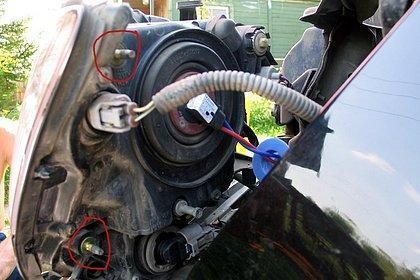 один саморез (Я вообще то еще пару саморезов под бампером открутил. Это если снизу спереди глянуть – по углам. Но мне кажеться этого можно не делать – бампер и так отойдет немного вниз.) : б) отвернуть пару саморезов бампера, немного опустить край бампера один на краю бампера под покрылком : в) соответственно отстегнуть все лампочки (см. ФОТО 1) : г) открутить гайку сверху фары ( та, что под капотом ) ... и еще саморезик черный в уголке. Его видно. : д) головкой на 10 с удлинителем открутить два болта под подкрылком ( говорят - самое сложное )