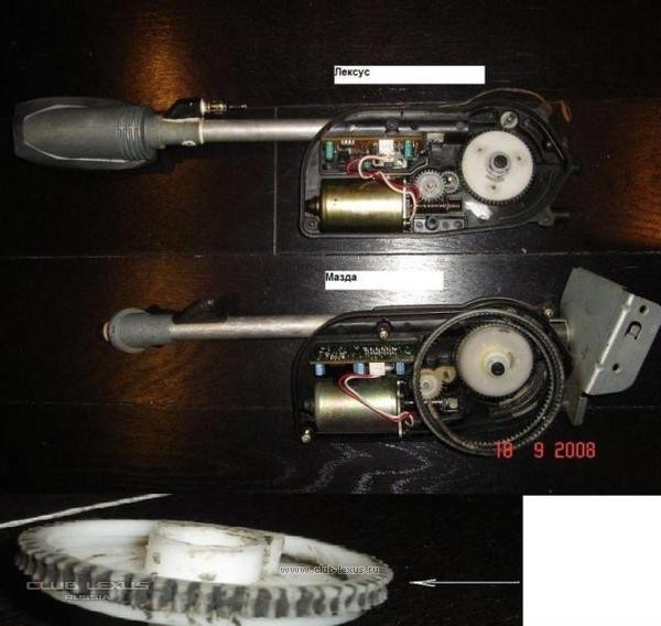 RX300 американец, 2000 год. Штырь телескопической антенны стал выдвигаться рывками, через некотрое время вообще не шевелился, только трещала. Снял антенну и с механизмом в руках поехал на разборку на Осташковском шоссе. Подбирали просто по схожему внешнему виду. Купил не от RX300 за 1500 рублей в очень хорошем состоянии. Разобрал, переставил внутренние шестеренки и моторчик в свой родной корпус. Смазал как следует и все заработало. Большая шестеренка на фото это и есть та деталь, которая стирается и перестает выдвигать антенну. Внутри металлической телескопической антенны проходит пластиковый шнур с насечками, его эта шестеренка и толкает для выдвижения или складывания штыря. Со временем стирается и к сожалению отдельно не продается, только весь механизм в сборе. Его цена около 5000 рублей, но можно сэкономить купив также на разборке.