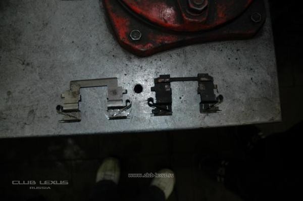 Теперь снимаем колеса Будем производить замену передних колодок. Сдавливаем суппорт и снимаем старые колодки. Все в грязи. Снимаем тормозные скобы и идем к верстаку. Берем щетку по металлу и отчищаем их. Ставим скобы на место. Теперь берем специальную бронзовую смазку и наносим ее на колодки, устанавливаем тормозные пластины. Устанавливаем новые колодки на место.. При этом обязательно смазываем направляющие, с использованием смазки для направляющих