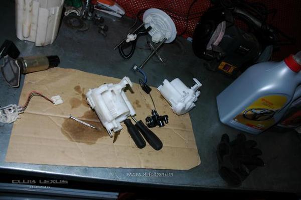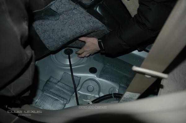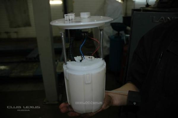 А теперь меняем топливный фильтр, который находится в задней части авто, за водителем. Производить замену топливного фильтра необходимо при пробеге 80.000км. Не более. В противном случае, хотя его и так тяжело открутить, сделать это будет практически невозможно!!!!!! Снимаем ковролин, и заднее сиденье Снимаем крышку… Вот он родной…( Да на LX 470, меняется он проще т к находится под капотом). Используем съемник и вынимаем бедолагу из топливного бака… Сливаем из него остатки топлива….