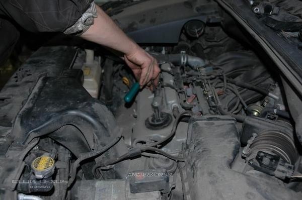 Снимаем датчик расхода воздуха и очищаем от грязи. Ставим на место. Датчик грязный, необходимо посмотреть состояние свечей. Для этого снимаем кожух двигателя, используя шестигранник, берем свечной ключ и выкручиваем одну свечу…Смотрим и делаем вывод…Больше никогда не заправляемся 95 бензином, только 92. Вердикт на следующем ТО 90000 производим замену свечей.