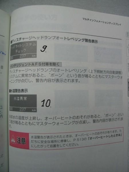 Оригинал сообщения находится здесь Фото из мануала находятся здесь Может кому пригодиться перевод надписей которые могут появиться на минидисплее на приборной доске вместе с восклицательным знаком. Первая страница 1.Предупредительное сообщение об открытом люке (Moon roof) Люк открыт Для машин, оборудованных люком Moon roof Открывание двери со стороны кресла водителя при переключателе питания, установленном в положение OFF или ACC (климат контроль), и при открытом люке сопровождается предупредительным звуковым сигналом, а на экране вывода предупредительных сообщений начинает мигать надпись соответствующего содержания. • Закрывайте люк Moon roof, когда оставляете машину без присмотра. • Проверяйте, полностью ли закрыт этот люк, когда оставляете машину или отправляете её на мойку. 2.Предупредительное сообщение при запуске гибридной системы Во время запуска гибридной системы жмите на тормоз При подаче питания и последующем двукратном переключении включателя питания без активации тормоза на экране в течение нескольких секунд высвечивается указанная выше надпись. 3.Предупредительное сообщение о недостаточности давления масла в двигателе Давление масла в двигателе недостаточно При отклонении от нормы давления смазочного масла раздаётся предупредительный звуковой сигнал, а на экране вывода предупредительных сообщений начинает мигать надпись соответствующего содержания. Вторая страница 4.Предупредительное сообщение о том, что машина не снята со стояночного тормоза Машина не снята со стояночного тормоза Если машина не снята со стояночного тормоза, то при наборе скорости cвыше 5 км/ч высвечивается соответствующее предупредительное сообщение. 5.Предупредительное сообщение о неполадках в системе курсовой устойчивости VSC Проверьте систему VSC Эта надпись высвечивается при наличии неполадок в системе курсовой устойчивости автомобиля. • Появление данного сообщения означает, что не работает лишь система курсовой устойчивости, тогда как обычныая ходовая система автомобиля функционирует нормально. Третья страница: 6.Проверить систему полного привода 7.Проверить гибридную систему Наличие неполадок в компонентах гибридной системы – электродвигателе, инверторном преобразователе, аккумуляторе электропривода, блоке электронного управления (ECU) и др. – при включённом индикаторе готовности к началу движения (READY) сопровождается предупредительным звуковым сигналом, а на экране высвечивается соответствующая надпись. 8.Предупредительное сообщение о недостаточности уровня жидкости в бачке омывателя. Уровень жидкости недостаточен Четвертая страница: 9.Проверить систему авторегулировки положения передних фар (на газоразрядных лампах) За исключением автомобилей, оснащённых адаптивной системой переднего света (AFS) Эта надпись и предупредительный сигнал появляются в случае возникновения неполадок в системе регулировки угла наклона передних фар. 10.Предупредительное сообщение о повышенной температуре охлаждающей воды Пятая страница: 11.Предупредительные сообщения, касающиеся электронного ключа а.) Ключ не обнаруживается г.) Батарейки на исходе б.)Переведите в диапазон P д.) Блокировка рулевой колонки не снята в.) Ключ не подходит е.) Проверить систему блокировки рулевой колонки