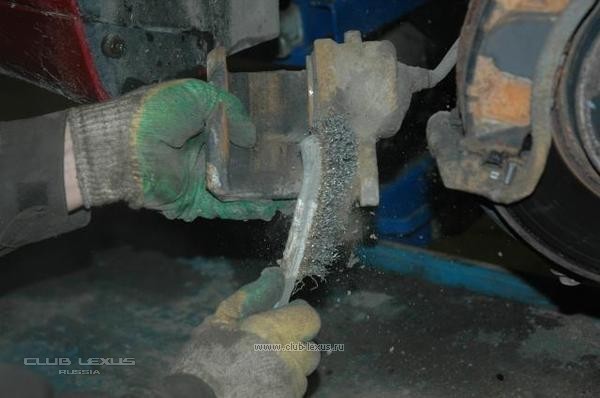 · Очищаем металлической щеткой от грязи тормозные механизмы