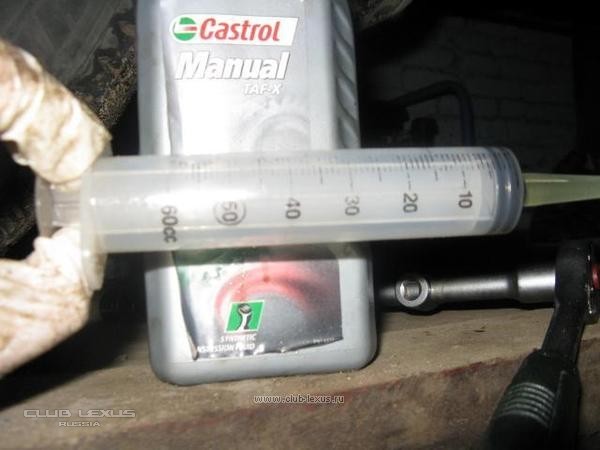 Для замены масла в раздаточной коробке понадобится: гаечный ключ на 24 для откручивания сливной пробки (фото 1, 2), головка на 24 и удлинитель для откручивания заливной пробки (фото 3), для заливки масла хорошо подходит медицинский шприц на 60мл. и более (фото 4). Из самой масляной канасты туда не залить и шприцом для заливки трансмиссионного масла, которые продаются в авто-магазине объемом 1 литр не подлезть, ну и само масло (не более 1 литра), тут каждый выбирает сам.