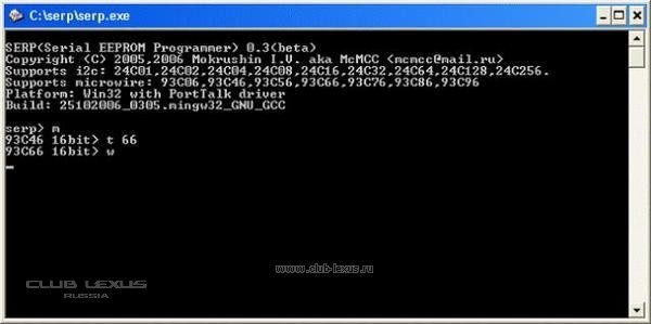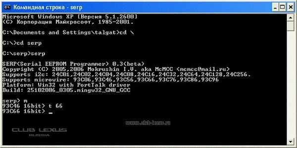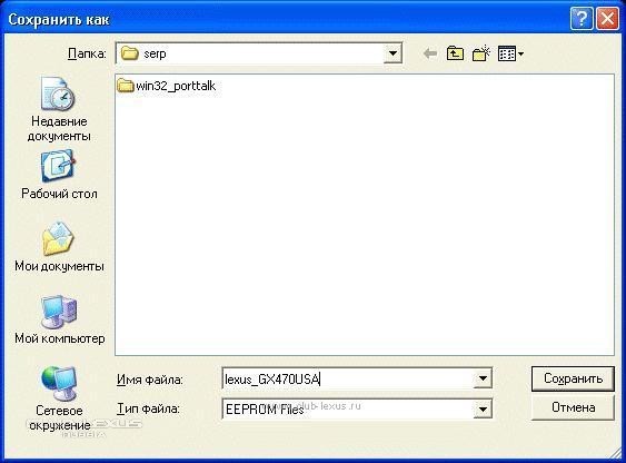 Cчитываем данные из микросхемы в файл, вводим команду r, появится окно для сохранения файлов, выберем папку для сохранения c:serp, введем имя файла (например lexus_GX300¬USA) и нажмем "OK". Все создаваемые файлы для чтения и записи имеют расширение BIN.