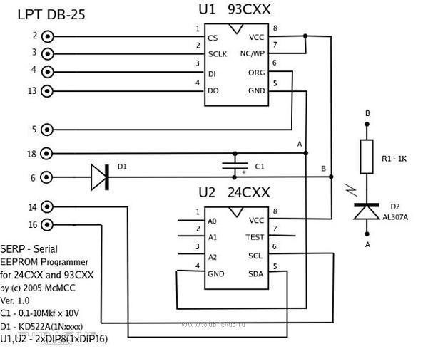 Берем шнур от принтера LPT, режем пополам и припаиваем 4 провода непосредственно на ножки микросхемы в следующем порядке: