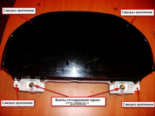 4. Вывернуть два самореза в верхнем козырьке и два самореза в нижних углах приборной панели.