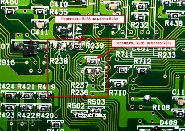 2. Перепаять резисторы R236 на свободную площадку R237 и R238 на свободную площадку R239.