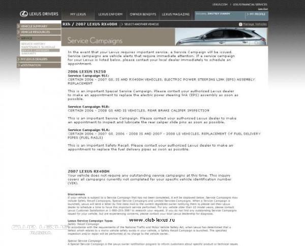 В меню MY LEXUS > SERVICE теперь можно посмотреть историю обслуживания автомобиля по датам (SERVICE HISTORY), а также список сервисных кампаний, под которые подпадает Ваш автомобиль (SERVICE CAMPAIGNS).