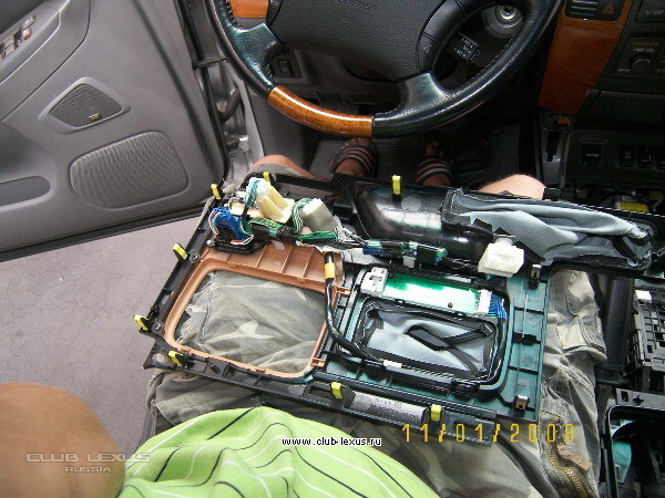 6 возможно самое трудное. Посмотрите внимательно фото где у этой панели и какие крепления. На самом деле всё просто. Обычниы пистоны. В левом верхнем углу разъём белого цвета – не забываем отключить а потом при сборке подключить J