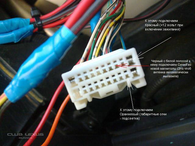 -Синий (антенна), Оранжевый(освещение), Красный(+12 от замка) вынимаем из белого десятиконтактного штекера и зачищаем!
