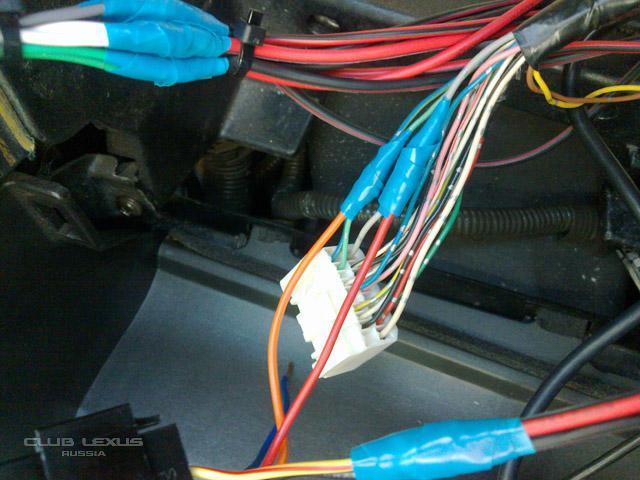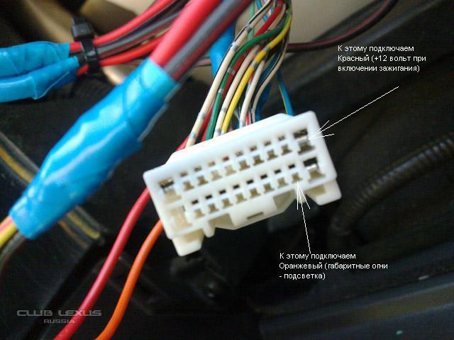 -Синий (антенна), Оранжевый(освещение), Красный(+12 от замка) вынимаем из белого десятиконтактного штекера и зачищаем!