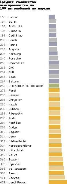 Среди марок девятый год подряд лидирует Lexus – в среднем 87 неполадок на каждые 100 машин этой марки. Причем у самого надежного автомобиля - Lexus SC430 - количество неполадок на каждые 100 автомобилей – всего 44.