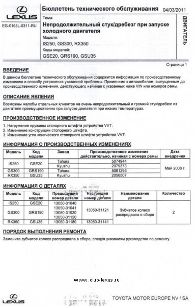Симптомы - когда авто долго стоит 2-3 дня или очень холодно -15-20 при запуске двигателя слышен отчетливый "лязг" или "шум" или "дребезг".... называйте как хотите... При плановом прохождении ТО сказали, что да, знаем о проблеме, но рекомендаций по устранению нет. Кое где из ОД меняли муфту VVTi в сборе по гарантии, где-то просто отказывались это делать. Мне рассказывали, что ролик натяжения приводного ремня регулируется давления масла и мол пока двигатель не заведется, гремит цепь, потом как давление масла появится, все ок (все со слов мастеров приемщиков). Тема много раз обсуждалась на форуме!