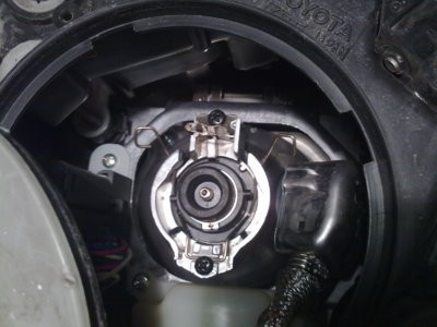 По габаритам и дальнему все меняется просто поворотом лампы, с ксеноновой лампой ближнего несколько сложнее. Лампа прячется под крышкой. Открываем ее. Под ней металлический разъем. Поворачиваем и снимаем его. Отгибаем "усики" крепеления лампы и снимаем ее. Установка новой в обратном порядке.