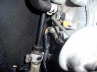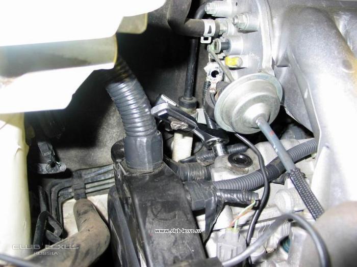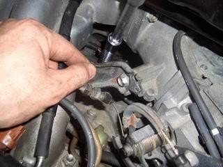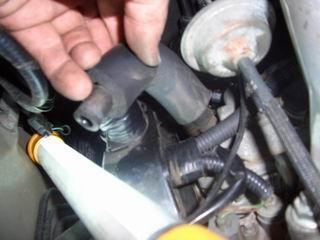 2. Для замены левой свечи в дальнем ряду для начала надо отсоединить трубку и, слегка открутив гайку, переставить, как показано на фото, проводочки, так будет легче вынимать наконечник (у меня они торчали вниз).