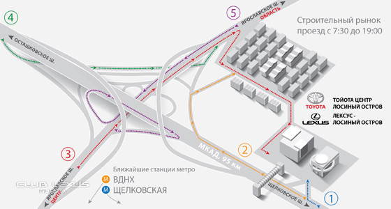 При движении по Ярославскому шоссе в сторону области пересечь МКАД, далее первый поворот направо на строительный рынок. Проехать через территорию рынка насквозь. Слева - Дилерский Центр Лексус - Лосиный Остров. Проезд через территорию рынка с 7.30 до 19.00.