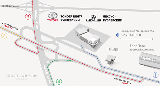 1. При движении из Центра города по Рублёвскому шоссе в сторону МКАД, у поста ДПС, держась правой стороны, съехать на выезд, ведущий к внутреннему кольцу. Далее с правой стороны въезд в Дилерский центр Лексус-Рублёвский по пандусу наверх.