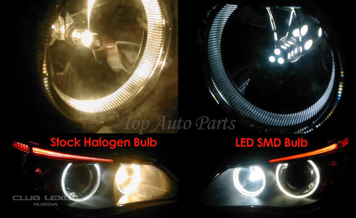 Если так же смотреть, то и галогенка светит вбок, т.к. спереди у нее технологическая заглушка