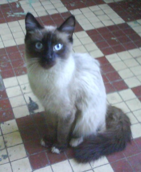 Приблудился в подъезд совершенно потрясающей красоты кот, год- полтора от роду, помесь сиамского с длинношерстным (кажется, помесь Ангоры с породой Сноу-Шу), с ярко-голубыми глазами.