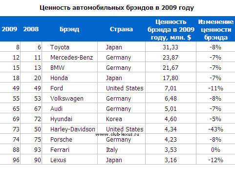 Сегодня самыми сильными автомобильными брендами являются 12 известных марок, которые, как оказалось, по ценности своих брендов конкурируют с производителями довольно простых и прозаичных товаров. Так, Lexus в табели о рангах брендов стоит на ступеньку ниже фирмы Adobe, производителя программного обеспечения, и на две ниже, чем банковские карточки системы Visa.