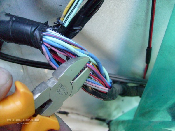 В пучке проводов, идущих к пульту стеклоподъемников, нужно найти красно-синий провод (именно в нем меняется полярность), перерезать его, один конец заизолировать, а другой, идущий к пульту - соединить с одним из проводов управления зеркалами - у себя я нашел (+) в положении ACC на желтом проводе (вот тут я не совсем понял: судя по схеме, напряжения там быть не должно, тем не менее оно есть).