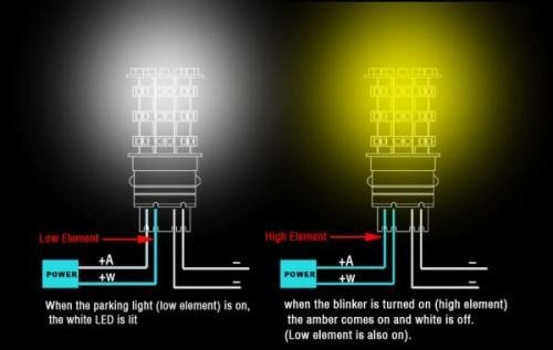 Т.е. когда включаешь осн. габариты, то и на + к low element поступает питание.. соответственно включаются белые диоды на лампе В-Ледс. А поворотник как прежде, как бы по старой схеме работает.