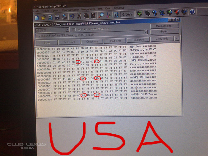 11. Запускаем программу, которая шла в комплекте с программатором ТРИТОН. Там выбрали наш чип EEPROM 24C02, считали с него код и поменяли значения как ниписано в начале топика (68 на 66 и 49 на 4В). Отметил красным. После чего сохраняем чип.