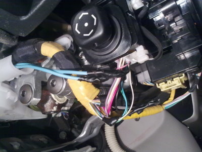 7) второй конец провода от реле соединяем с розовым проводом на переключателе света; черный провод на переключателе сажаем на массу; провода пропускаем через пластиковый желоб вместе со штатной проводкой
