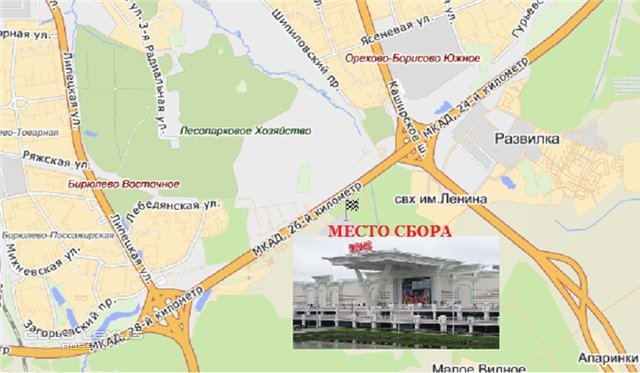 25 км МКАД (внешняя сторона), пересечение с Каширским шоссе. При движении из центра по Каширскому шоссе, доехав до МКАД, двигайтесь по внутренней стороне кольцевой дороги до следующей развязки с ул. Липецкой, затем, перестроившись на внешнюю сторону, следуйте до 25 км МКАД.