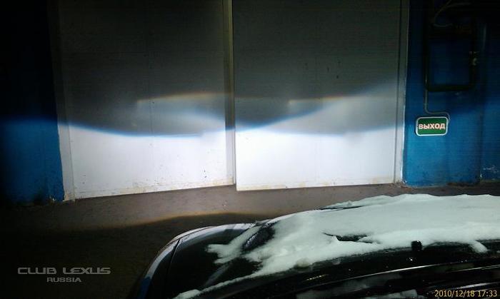 итак, сначала в линзованной оптике стояли старые D2R, фото как светило ниже, могу сказать что видимость была отвратительная, весь свет был куда то под ноги. причина насколько я понял банальная - те, кто мне менял фары просто поставили D2R лампы не заморачиваясь тем, что они не сели в посадочные места, то есть лампы просто стояли криво и не в фокусе