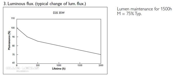 P.S. Еще стоит помнить, что ксенон со временем тускнеет. Такой график, падения яркости от времени работы, предоставлен компанией Philips