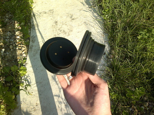 Думал недолго, взял фен и давай греть её) грел - вытягивал, грел вытягивал, потом опять грел и так до момента пока она не налезла) выглядит ужасно конечно, кому расскажу смеятся долго будут=)))