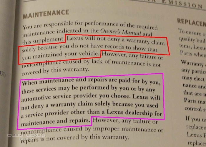2.Я бы с Вами в карты не сел играть- уж больно ловко Вы фишку передергиваете. Да, на этой странице Лексус не возражает, если вы за свой счет обслужитесь на другой СТО, и не требует , чтобы в сервисной книжке обэтом была сделана запись. Да, лексус говорит, что отсутствие записи в сервисной книжке не приводит к снятию гарантии. Дилеру не нужны эти записи, у Дилера есть компьютерные базы, в которых отражаются все мероприятия, проводимые на всех гарантийных авто. НО, и этих НО в информационном буклете пользователя о гарантиях расписано на каждой странице. Просто надо внимательно читать. Хотя бы следующая фраза после обведенного фиолетовым абзаца. Это касается сроков на различные узлы и агрегаты, оговариваются условия их замены и ремонта, условия обслуживания, есть отдельные условия, при которых гарантия производителем перестает поддерживаться. Ну да что я это все пересказываю, просто прочитайте буклет от начала до конца, и тогда картинка может быть и сложится, наконец, в Вашей голове.