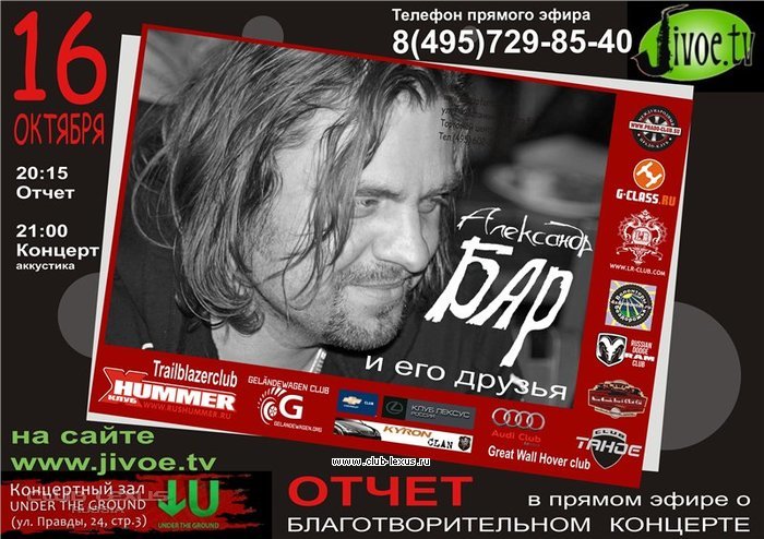 Дорогие друзья, в среду 16 октября с 20:15 до 22 на портале Живое ТВ () в прямом эфире, мы расскажем Вам, что было сделано всеобщими усилиями для Детских домов. Мы также поделимся нашими планами в этом направлении. В 21 ч. начнется акустический концерт Александра БАРа и его друзей. Желающие попасть в студию и активно поучаствовать в дискусии в прямом эфире отправляйте СМС с ФИО на телефон +7 (903) 729-85-40