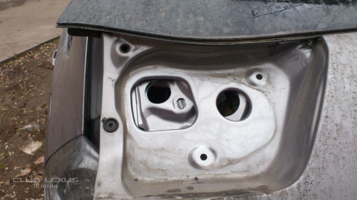 Фонарь держится на трех гайках на 10, одна из которых видна с торца двери без сняти обшивки, две выкручиваются под обшивкой. Четвертая точка - клипса, поддевать надо начиная именнно с нее! на фотке - левое верхнее отверстие.