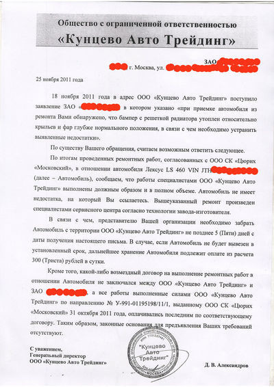 P.P.S. Эти "нехорошие люди" еще и бумаги задним числом подписывают. звонил сегодня (28 ноября) спрашиваю "где ответ - прошло 10 дней". Отвечают: "пришлем сегодня в рассмотрении у юристов", присылают с датой 25 ноября.