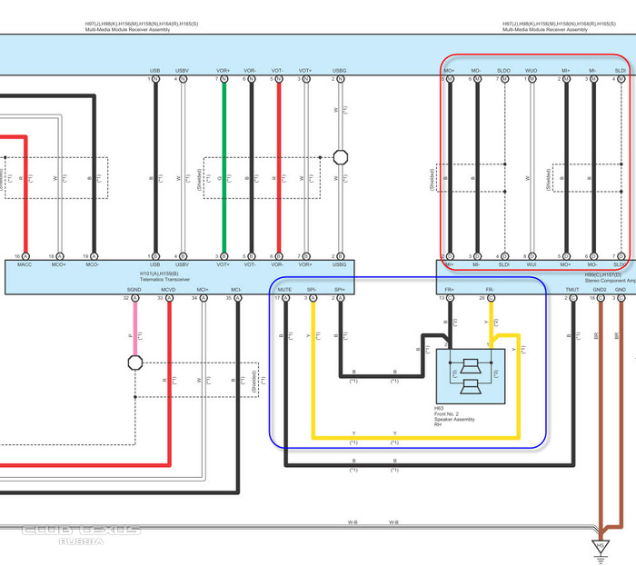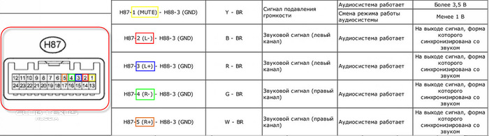 Я не электронщик но судя по схеме сигнал на входе можно снять попробовать со штекера №87. По ходу японцы на новых авто не стали особо мудрить и подают с ресивера два канала и сигнал mute на приглушение звука (красным обвел на схеме)...