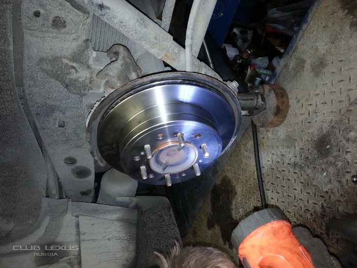 после сборки ручного тормоза и диска с супортом не забудьте отрегулировать колодки стояночного тормоза, а то останетесь без ручника. На фото видно мастер ищет в тех. отверстии диска регулятор разведения колодок для регулировки.