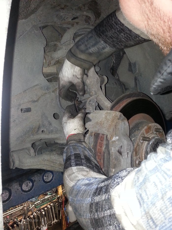 Начнем с передка. Колесо снято, приспособа за 200р для пережатия торм. шланга(вместо нее можно просто затыкать открученный шланг что бы тормозн. жидкость не текла)