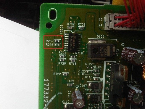 Достаём плату. Красным отметил резисторы R236, R237.