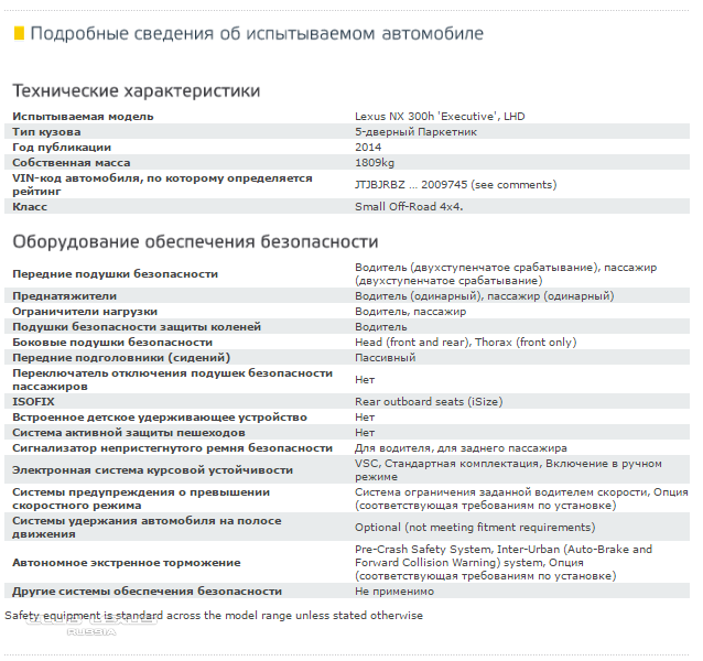 Паркетник Lexus NX заработал 14,4 балла во фронтальном ударе, в боковых — 8 и 6,7. Максимальные баллы получены в имитации наезда сзади. Неплохо обстоят дела с детьми (11,8 и 10,5 балла за «младшего» и «старшего»).